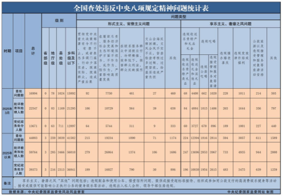 4月27日,中央纪委国家监委公布了2025年3月全国查处违反中央八项规定精神问题汇总情况。当月,全国共查处违反中央八项规定精神问题16994起,批评教育和处理22547人,其中党纪政务处分13671人,这是连续第139个月公布月报数据。